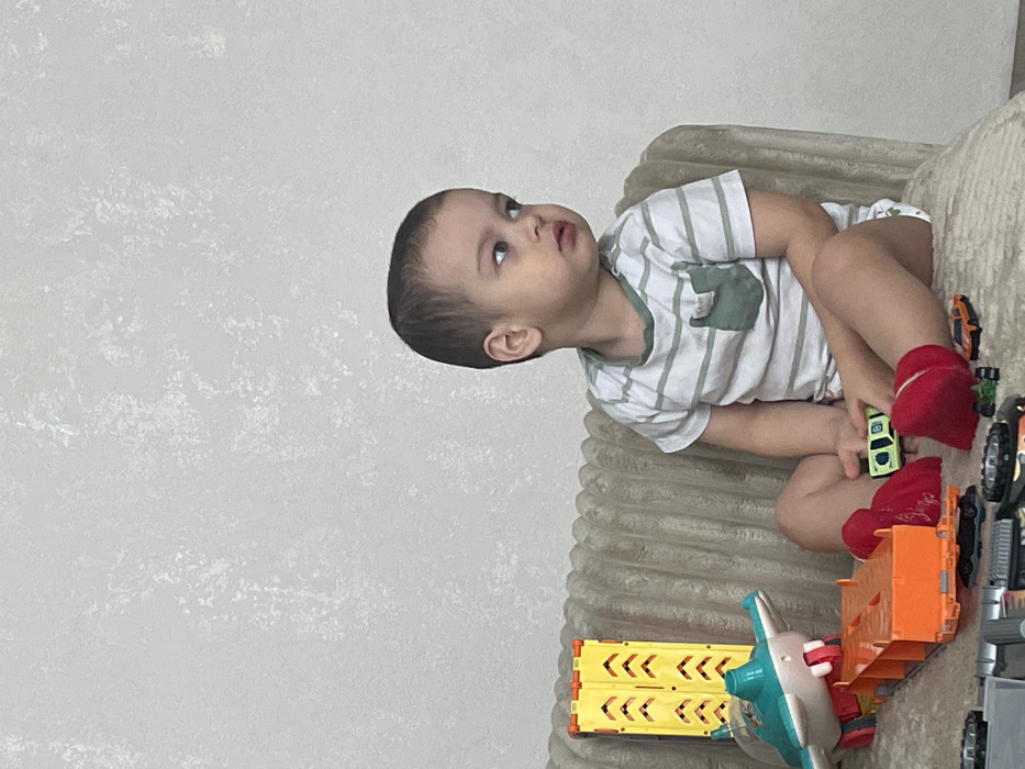 The scene is an indoor domestic setting, located in Izhevsk, Russia. A young child, appearing to be a toddler, is seated on a textured, light brown upholstered sofa. The child wears a white t-shirt with thin light green horizontal stripes and a solid light green chest pocket, along with red socks. Their gaze is directed towards the right side of the frame. In the child's left hand, a small green toy car is held. Surrounding the child on the sofa are various toys, including a teal and white toy airplane attached to an orange open-top trailer, a yellow plastic track section with chevron markings, a small orange toy car, and several dark-colored toy cars. The background features a light grey wall with a subtle, irregular textured finish.