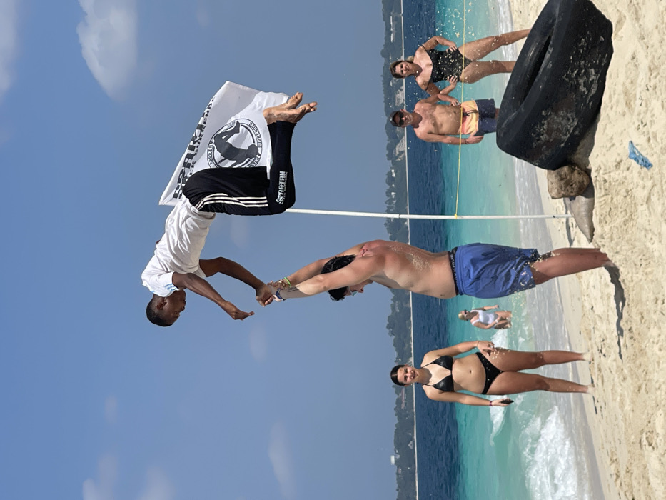 A daytime image depicts an acrobatic performance on a sandy beach in Zanzibar, Tanzania. A dark-skinned male, wearing a white t-shirt and black athletic pants with white stripes and "SPARTAN" branding, is suspended horizontally in the air, barefoot. His arms are extended downwards, gripping the wrists of a lighter-skinned male who stands on the beach. A white flag with a black "SPARTAN" logo is attached to the suspended male's lower back or leg, fluttering to the right. The standing male is shirtless, wearing blue swim shorts, with sand particles adhering to his skin, supporting the suspended individual by their clasped wrists with his arms vertically extended. To the left of the central figures, a female in a black bikini stands on the wet sand near the water's edge. Further back, a female in a white swimsuit is partially submerged in the water. To the right, a shirtless male in multi-colored swim shorts and a dark baseball cap, alongside a female in a dark, possibly polka-dotted, one-piece swimsuit, stand in the shallow turquoise water. A white pole with an attached horizontal line extends into the water behind the standing male. In the immediate foreground on the right, a large, weathered black tire rests on the sand, partially covered by a rock, with a small piece of blue plastic debris nearby. The scene is set under a clear blue sky with minimal cloud cover, against a backdrop of clear turquoise water near the shore, deepening to blue further out, with a distant landmass and visible structures lining the horizon.