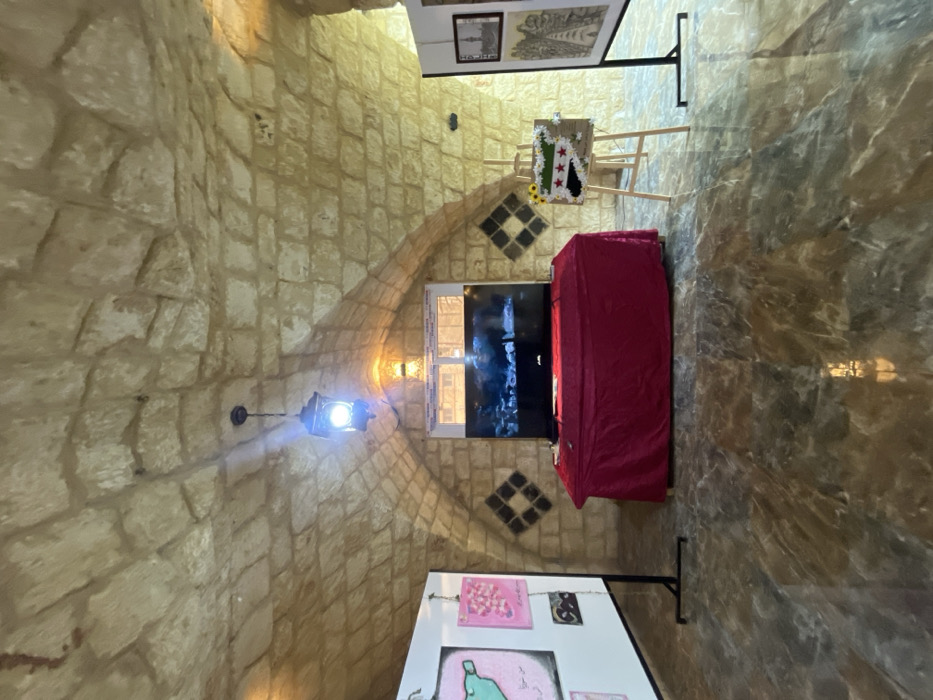 The image displays an indoor exhibition space within a building in Idlib, Syria, characterized by traditional architecture
