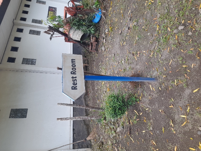A blue and white "Rest Room" sign is mounted to a blue pole and points to the left