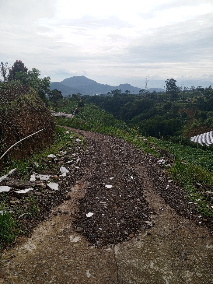 A damaged concrete road curves uphill through a verdant landscape. Hills and mountains rise in the distance under an overcast sky. Lush vegetation covers the sides of the road, while debris and broken pieces of concrete litter the edge. Power lines are visible in the background, interspersed among the trees. The road's disrepair is evident, with large sections missing or deteriorated.