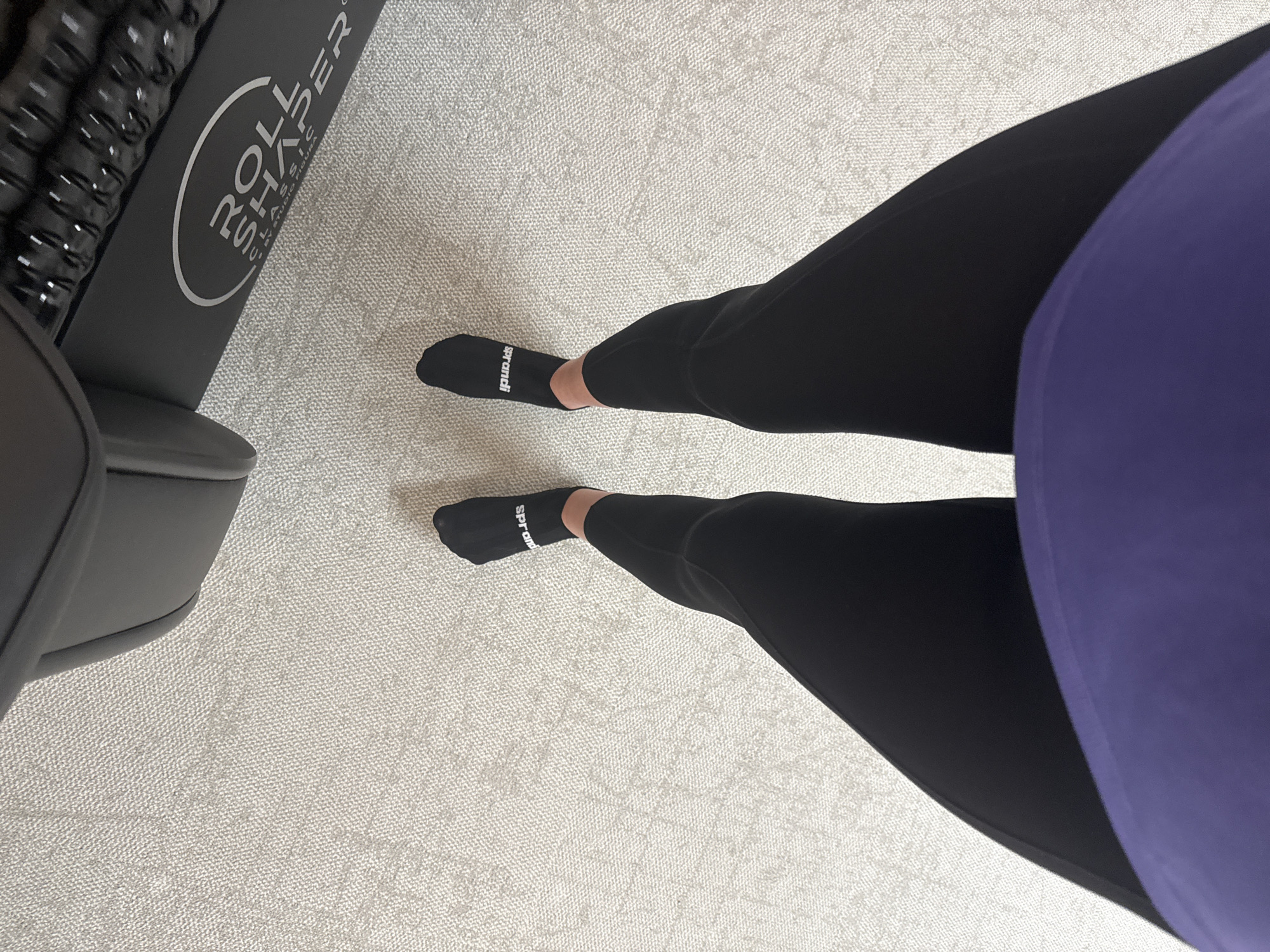 A downward, first-person perspective captures an individual's lower body within a Studio Figura facility, located in Riga, Latvia. The subject wears a purple garment (visible at the lower edge), black leggings, and black ankle socks. Each sock displays the white text "sprandi" on the instep. The individual stands on a light-colored, short-pile carpet. In the upper right quadrant, a black "ROLL SHAPER CLASSIC BY STUDIO FIGURA" machine is partially visible. The machine features a textured roller and prominent white branding, including the product name "ROLL SHAPER CLASSIC" and "BY STUDIO FIGURA" within an oval logo. The scene depicts a static, upright posture, suggesting the individual is positioned near the machine for use.
