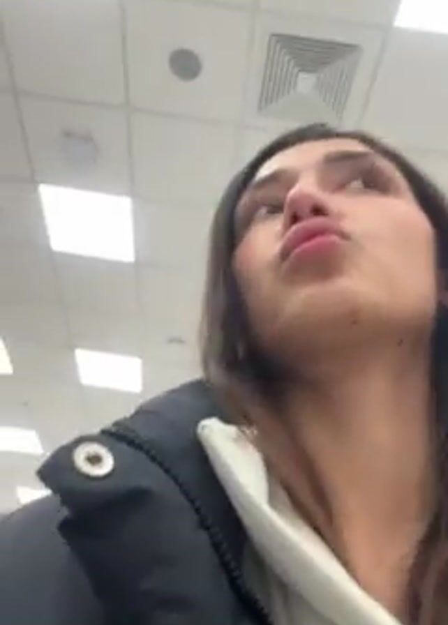 two people in a store, filmed in low-angle shots. First, a young woman with long brown hair, wearing a black puffer jacket over a white hoodie, looks up at the ceiling with her lips pursed, and then directly at the camera. The ceiling is white with square recessed lights. The camera then moves to show a man with a beard, wearing glasses and a red and white plaid shirt over a white jacket, talking on a cell phone. There are shelves of blue and white merchandise in the background. The ceiling and lighting are similar to the first shot.