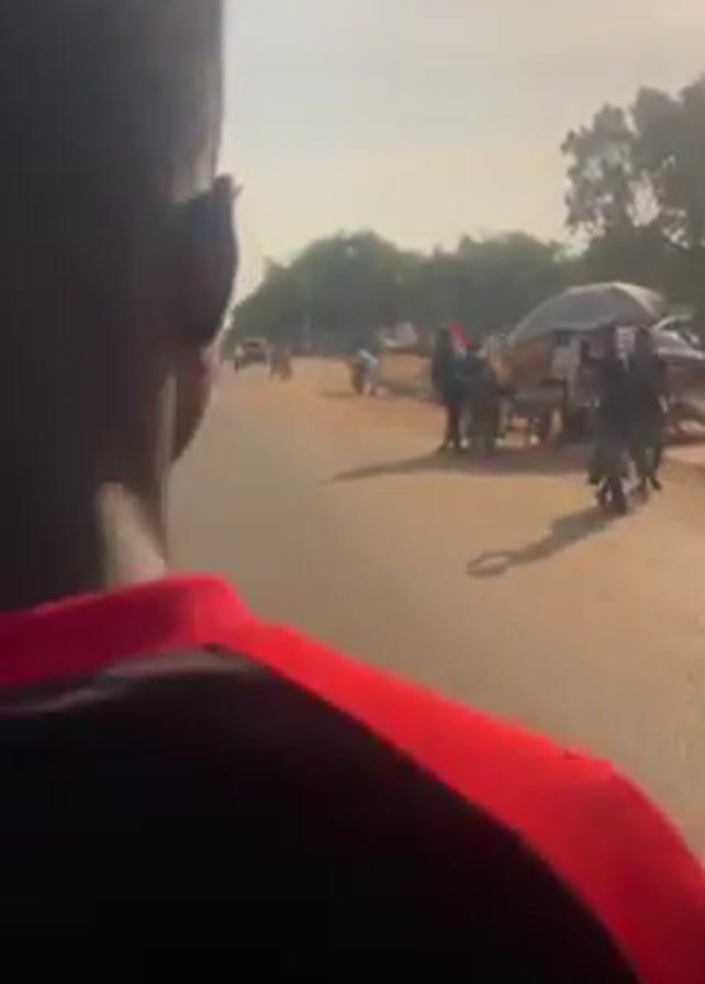person from the back, wearing a black shirt with red accents, looking at a street scene with several individuals and vehicles. The street appears to be in a somewhat rural or less developed area, with stalls or stands along the side. The lighting indicates it is either early morning or late afternoon. There are trees in the background, and power lines are visible overhead. People are walking and interacting near the stalls.