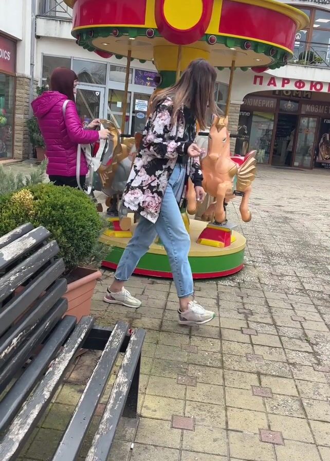small, outdoor carousel in an urban area. A woman in jeans and a floral jacket walks toward the carousel. A young child, already on the carousel, reaches for a peach-colored horse with gold wings. Another woman stands nearby, holding a small bag. The carousel features three horses and an elephant. The base of the carousel is painted in green, yellow, and red stripes. A weathered wooden bench is in the foreground. In the background, there are shops with signage in what appears to be a Slavic language. The pavement consists of light-colored brick.