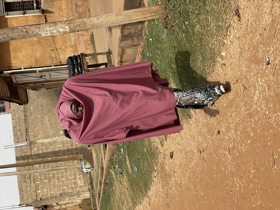 The image portrays an outdoor scene in Muchiya, Nigeria, under bright daylight. A woman walks towards the viewer on a reddish-brown dirt path that is scattered with wood shavings and minor refuse. She is the central figure, dressed in a dark pink head covering and a voluminous, matching outer garment that largely obscures her form, revealing patterned trousers with white and blue-green leaf motifs, and light-colored sandals. Her face is partially visible beneath the head covering, displaying a neutral expression. To the right of the path, a weathered wooden utility pole stands next to a single-story building with a rough, yellowish-brown facade, featuring a wooden door and a barred window. A small wooden table loaded with several black plastic bags is positioned near this building. To the left of the woman, patches of dry green grass border the path. In the background, a concrete block wall runs horizontally, with what appears to be open drainage channels beyond it. A blurred figure wearing a white cap is faintly visible behind the concrete wall on the left. Further in the distance, a multi-story building with a red roof is partially visible against a light blue sky.