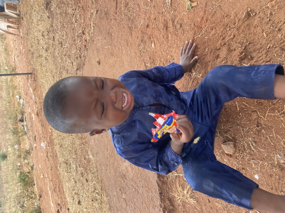 A young boy sits on the ground in blue overalls, holding a partially unwrapped snack. He is smiling, possibly laughing. The ground is mostly dirt with scattered grass. A few chairs are visible in the background. The boy appears to be enjoying his snack.