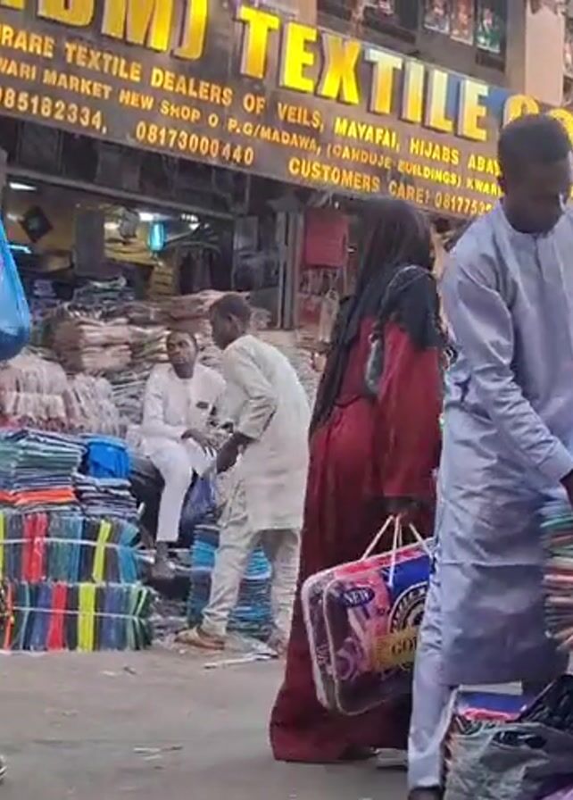 street scene in front of a textile company, possibly in a city in Africa. People are seen walking by, sitting, and looking at textiles that are stacked high. A man in a gray outfit is going through a stack of fabric. Another woman in a colorful dress walks by with a plastic bag in her hand. A boy walks past, looking at his phone. Several men are sitting near the entrance of the shop, one of whom is using his phone. The text on the shop sign reads "HDMJ TEXTILE COMPANY", and includes details such as "DEALERS OF VEILS, MAYAFAI, HIJABS ABAYAS". Overall, the scene depicts a busy commercial street with a focus on the textile trade.