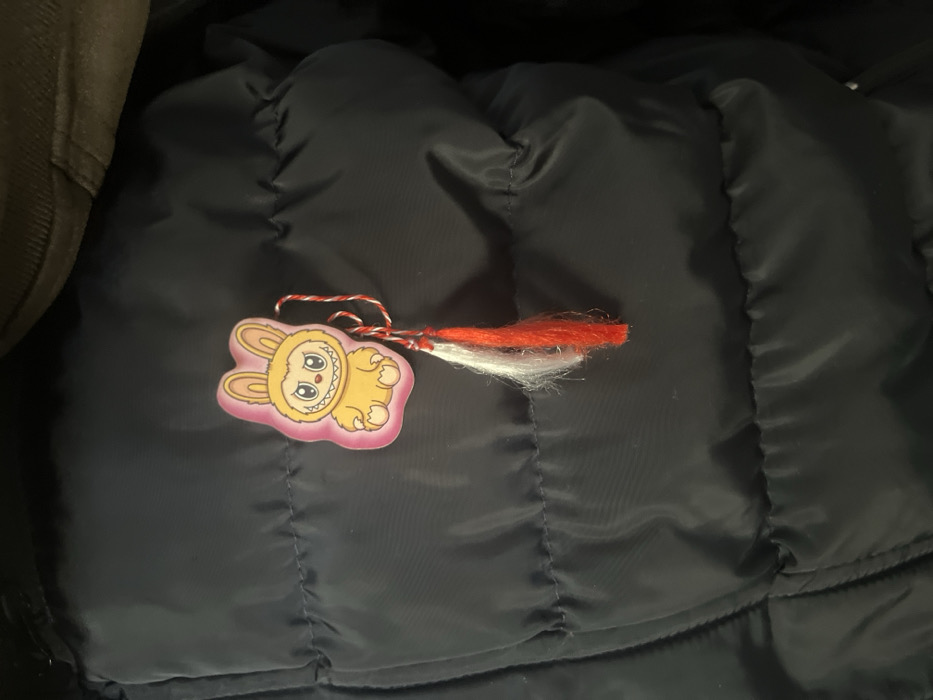 A close-up, downward-angled forensic image displays a black quilted puffer jacket as the primary surface. The jacket features distinct horizontal stitching, creating padded sections. Attached to the upper left quadrant of the jacket are two items. The first is a roughly bunny-shaped pin or sticker, characterized by a yellow body, large ears, and a pink border. Its face presents round eyes with small white pupils and a wide, grinning mouth with visible teeth. Directly beneath this character, attached by a twisted red and white string, is a martenitsa. The martenitsa consists of two short tassels: one white and one red, both composed of fuzzy, yarn-like material, hanging downwards. A small portion of a blurred, dark brown object is visible in the upper right background, suggesting an immediate adjacent item or surface. No individuals are visible. The specific location within the city of Etropole, Bulgaria, cannot be determined from the visual information provided in the image.