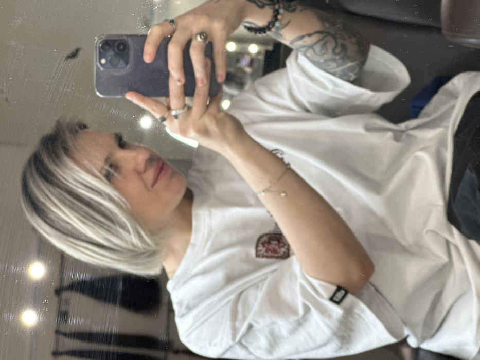 A female individual is depicted taking a mirror selfie in an indoor setting, purportedly located in the city of Ovoshchnoy, Russia. The subject has short, ash-blonde hair with visible darker roots, styled with a side part. She is wearing a loose-fitting, light-colored short-sleeved t-shirt with an indistinct graphic on the chest and a small black label on the left sleeve hem. She holds a dark-colored smartphone, consistent with an iPhone featuring a triple camera array, in her right hand to capture her reflection. Her right hand displays multiple rings: two on the index finger (one with a green stone), one with a green stone on the middle finger, and a silver-toned ring on the ring finger. Her left forearm is adorned with a full black-ink tattoo sleeve and two bracelets: a thin, gold-colored chain with a small spherical charm, and a multi-beaded bracelet. The background, visible in the mirror's reflection, includes several dark, elongated objects resembling hair extensions or wigs hanging on a rack to the left, and multiple circular light sources, indicative of a well-lit interior such as a salon or dressing room. The mirror surface exhibits minor smudges and scratches.