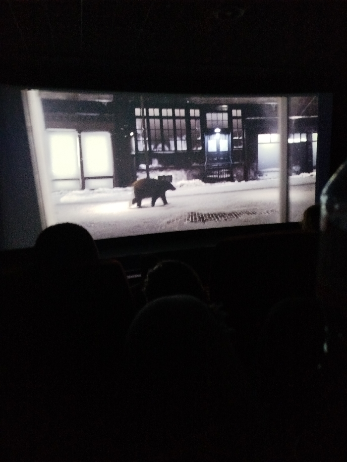 The image captures a cinematic projection within a darkened room, likely a movie theater, located in an unspecified city. The projected scene depicts a nocturnal, snow-covered street in a small town or urban environment. A large, dark-colored bear walks from left to right across the foreground of the brightly illuminated, snow-covered road. In the background, several dark buildings with multi-paned windows are visible; one structure prominently features an elevated entrance with a short staircase, glowing with internal light. Snow covers the ground and surfaces of the buildings, indicating winter conditions. In the immediate foreground of the photograph, dark silhouettes of at least three seated individuals, presumably audience members, are visible, indicating the perspective from within the viewing area. A blurred, dark, cylindrical object, possibly a drink container, appears on the far right edge of the frame.