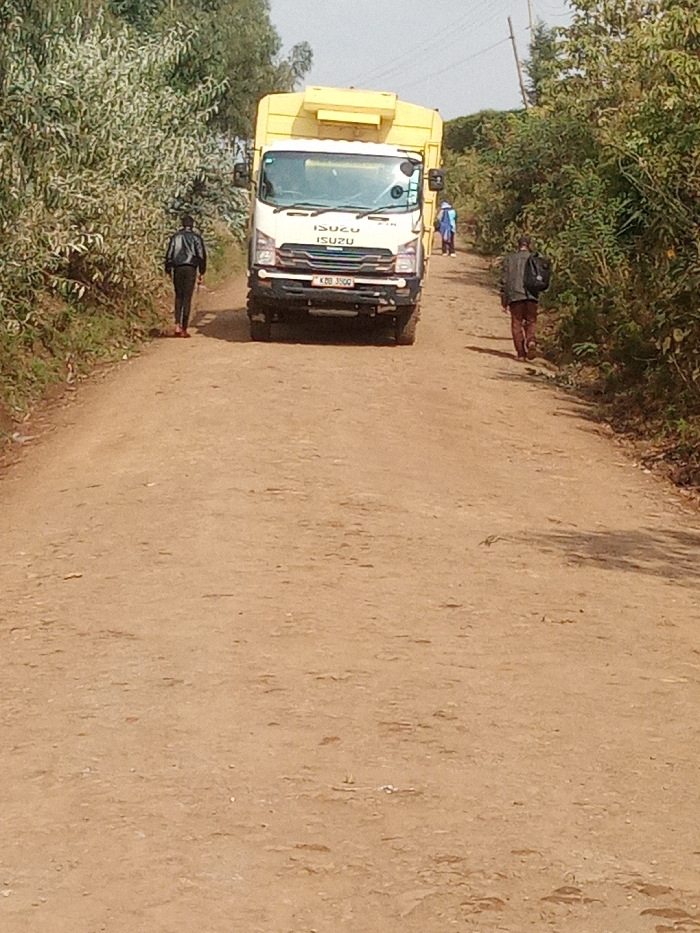 A white Isuzu truck with a yellow utility bed, license plate KBB 350O, is positioned centrally on an unpaved dirt road in Ndeiya, Kenya