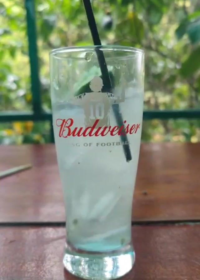 A Budweiser branded glass filled with ice and a clear liquid sits on a wooden table. A black straw sticks out of the glass, and a hand appears in the frame to stir the liquid. The glass has a depiction of Lionel Messi on it, along with the words "King of Football". The background features lush green foliage, suggesting an outdoor setting.