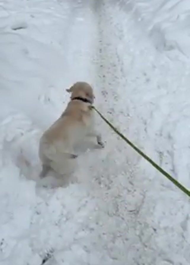 medium-sized, light-colored dog, likely a Labrador Retriever, sitting in the snow on a leash. It looks upward and then down at the snow. The dog sniffs at the ground, gets its leash stuck, and then looks at the camera. The environment is a snowy outdoor area with a cleared pathway.