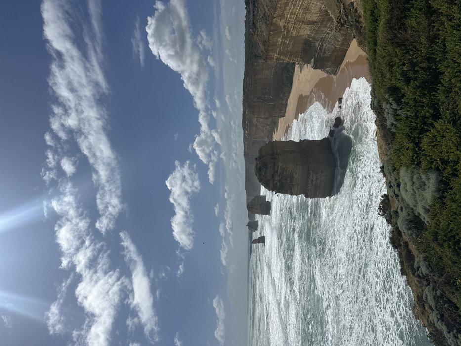 - "Twelve Apostles rock formations rise from the ocean along a sandy beach bordered by cliffs and green shrubbery" by FM-P0ePn2, licensed under CC BY 4.0