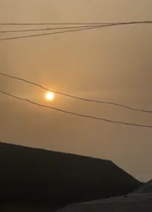 n outdoor scene with a pale sun visible in the hazy sky, intersected by power lines