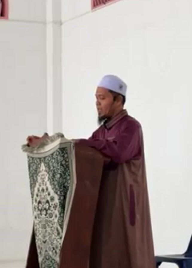 A man stands at a lectern. He is wearing a maroon robe and a white cap, and he has a short black beard. He appears to be speaking, possibly giving a sermon. The lectern is decorated with a patterned cloth. The room is white with a window at the top of the frame. There is a blue chair to the right of the lectern. The man stands in a medium shot.