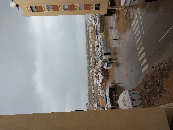 An elevated view captures a displacement camp and surrounding area in Khan Yunis, Palestinian Territory, on an overcast day with wet ground suggesting recent rain