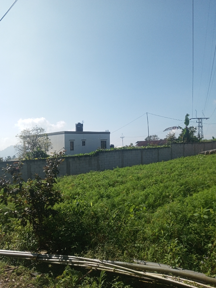 This image depicts an outdoor scene in Niz Lakuk, India, under a clear, bright blue sky with high sun exposure. The foreground features a cluster of light-colored PVC pipes, approximately four to five in number, resting horizontally on disturbed earth amidst dense, varied green vegetation. Directly behind this, the ground slopes upwards, covered entirely by a uniform expanse of short, vibrant green foliage. This green field is bordered in the midground by a solid, light grey concrete block wall, approximately two meters in height, extending horizontally across the frame. Beyond the wall, a two-story, rectangular white building with a flat roof is visible. A black cylindrical water tank and a small antenna structure are mounted on its roof. The building features several rectangular, dark-framed windows. To the left of the building, distant mountains are visible, partially obscured by lighter green trees and a few white clouds. To the right of the building, a metal lattice tower, utility poles, and power lines are present, with multiple thin black wires stretching across the upper right quadrant of the sky. No individuals or specific actions are discernible within the frame.