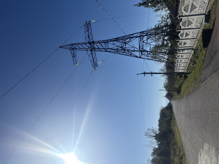 - "A tall electrical transmission tower dominates the left side of the frame against a clear blue sky with sun glare at the bottom" by FM-DELcs2, licensed under CC BY 4.0