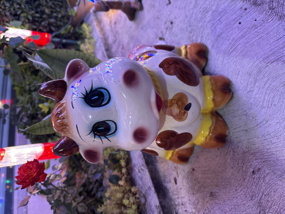 A ceramic cow figurine lies on a textured grey surface. The cow is primarily white with brown spots and ears. It has large, expressive black eyes with prominent eyelashes. A red detail is visible on the nose. The cow appears to be decorated with glitter. Lush greenery, a red rose, and a candy cane-striped pole are visible in the background, adding depth to the scene.