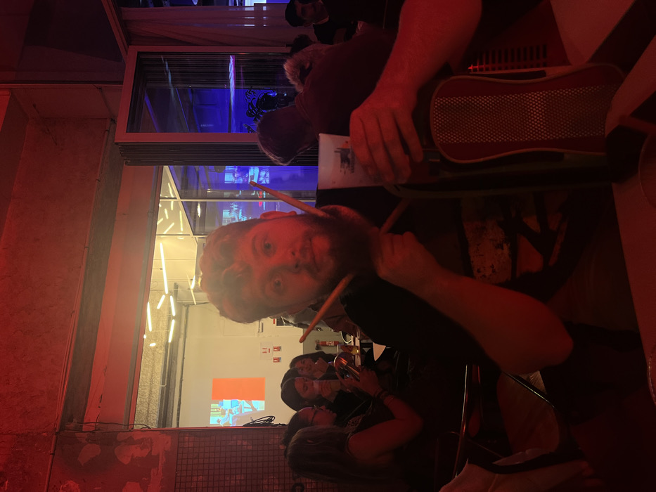 The image depicts an indoor night scene at Gare Saint Sauveur in Lille, France, characterized by prominent red ambient lighting. A Caucasian male with a beard and curly hair, appearing to be in his 20s or 30s, is centered in the foreground, looking directly at the camera with a slight smile and open mouth. He wears a dark t-shirt. He holds two drumsticks, crossed in front of him, with one tip near his left shoulder and the other near his right chin. His right hand holds a clear plastic cup bearing the "Gare Saint Sauveur" logo. A red and black object, possibly a padded case for an instrument, rests on a table to his right. In the mid-ground on the left, several individuals are seated at tables, their forms partially obscured by the red light. One woman, with lighter hair, is visible on the far left, and another individual appears to be interacting with a mobile device. The background reveals an expansive space with exposed concrete or similar architectural elements on the ceiling. To the far left, a projector screen displays an image with dominant orange and blue segments. Two red fire extinguisher pictograms are visible on a white wall section beneath the screen. Through a glass partition or large windows in the center-right and right background, a separate room or area is visible, illuminated distinctly by blue neon or LED lighting, featuring linear light fixtures and silhouettes of additional people.