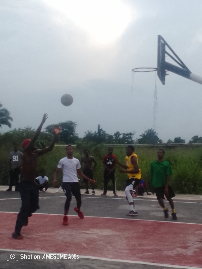 The image depicts an outdoor basketball game in progress on a court located in Egbagu, Nigeria