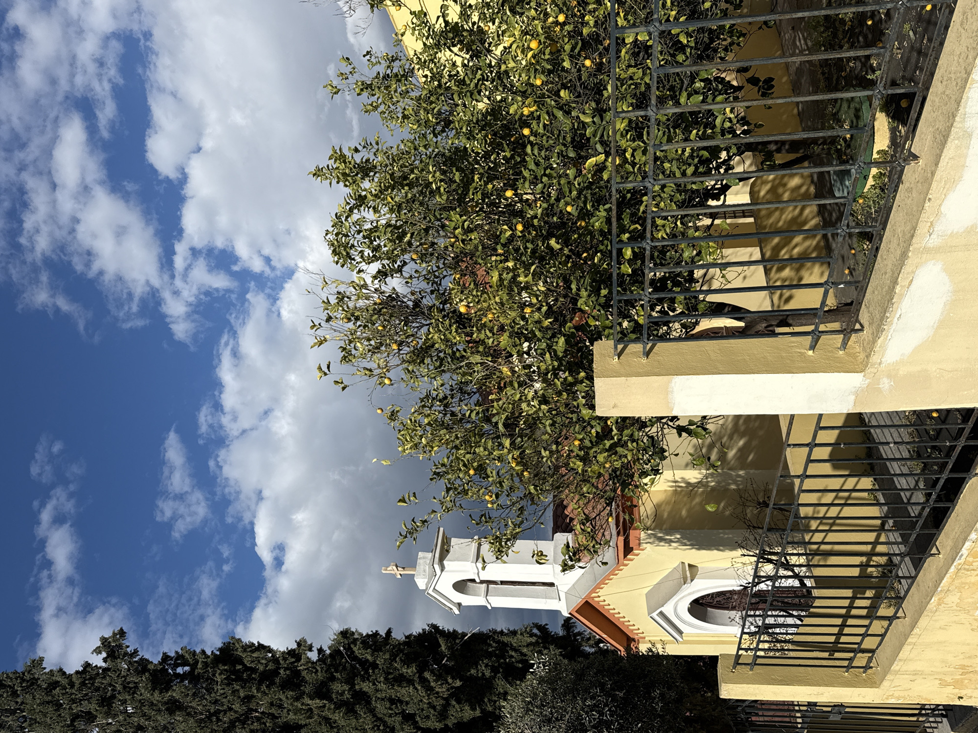 sunny day with a partly cloudy sky above a tree with lemons and a yellow building with metal bars on a balcony. A white church tower is visible behind the tree. The location is likely in Athens, Greece.