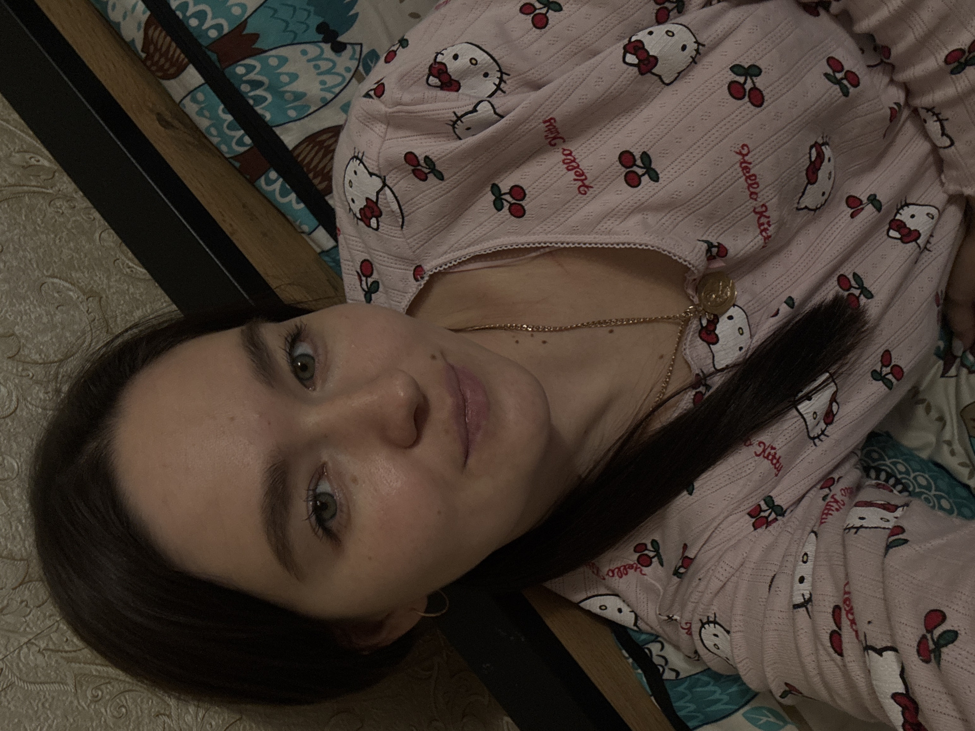A young woman is lying on a bed, her head resting on a patterned pillow. She is wearing a pink pajama top with a "Hello Kitty" and cherry pattern. She has dark hair and fair skin. A gold necklace is visible around her neck. The bed has a wooden frame and is covered with various patterned fabrics. The location is likely indoors, but the city of Chaikovsky, Russia is not discernible from the image.