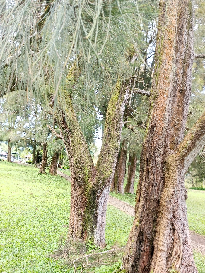 A verdant landscape features rows of trees with needle-like leaves, their trunks varying in thickness and covered in moss and rough bark