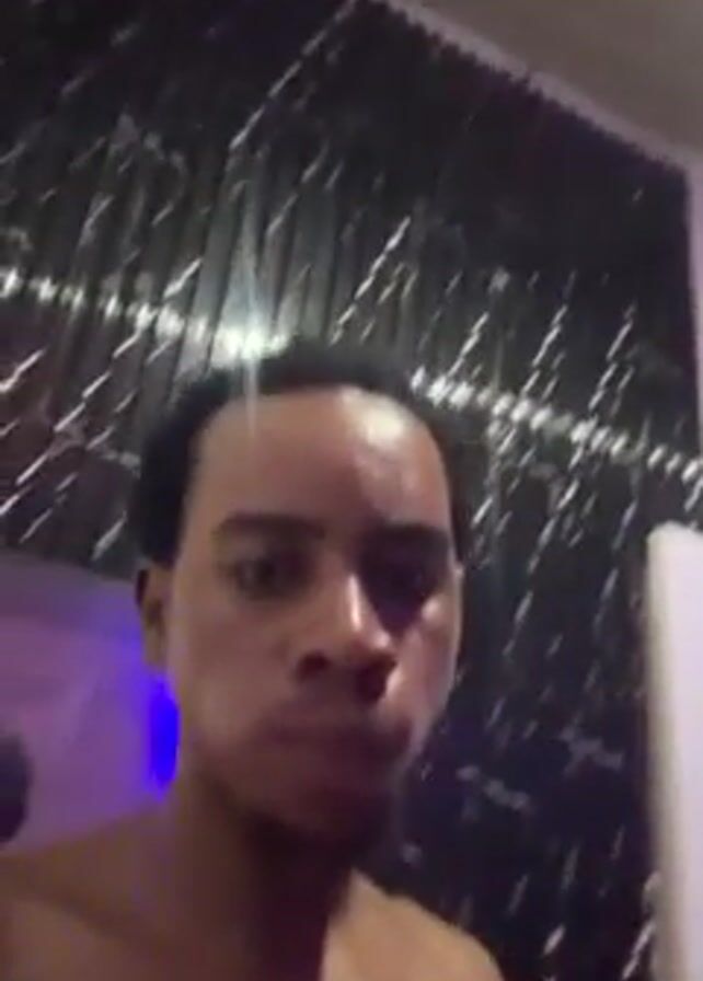 A young, shirtless man is eating a cookie in a room. He has short black hair and a bit of facial hair. He is holding the cookie in his right hand. Behind him is a wall covering featuring black and white geometric patterns. To his left, a blue light is visible, and to his right, there is a white surface, possibly part of a door or cabinet. The camera appears to be held at a low angle, looking up at the man.