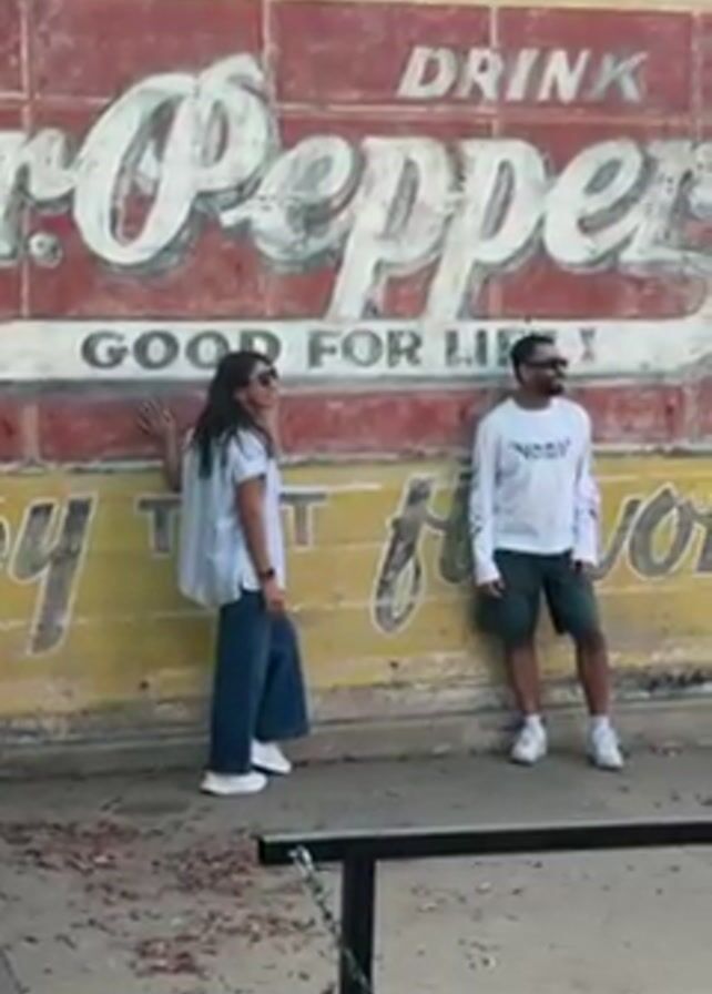 couple posing in front of a faded Dr. Pepper sign on a weathered wall. The woman is wearing a light blue striped shirt and dark wide-legged pants, while the man is in a white long-sleeved shirt and dark shorts. Both are wearing sunglasses. The sign reads "DRINK Dr. Pepper GOOD FOR LIFE". A black metal fence separates the camera from the couple. The camera then pans up and over to show a red painted structure with pipes and valves. In the background, people are walking. The setting appears to be an outdoor public space.