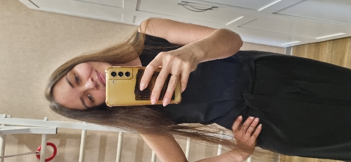 The image displays a mirror selfie of a female individual in an indoor setting, identified as Kudrovo, Russia. The subject, appearing to be an adult female with long, straight, brown hair, is wearing a black sleeveless garment featuring a tie-waist design. She wears light-colored nail polish on her fingers and a thin, gold-colored ring on the fourth finger of her left hand, which rests on her hip. In her right hand, she holds a gold-colored smartphone, which has a triple camera module and a dark rectangular adhesive feature on its back, positioned to capture her reflection. She exhibits a faint smile and looks directly into the phone's lens. The background shows light-colored walls, a white Swedish ladder with red gymnastic rings on the left side of the frame, and a white, multi-panel cabinet or wardrobe with silver handles on the right. The floor visible at the bottom is light-colored wood.