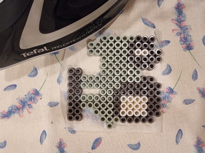 An image shows a close-up of a partially ironed, pixelated image of a cartoon character using gray, white, and tan fuse beads