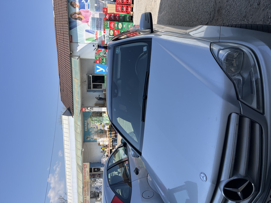 The image depicts an outdoor commercial area or parking lot in Goce Delcev, Bulgaria, under a clear blue sky. In the foreground, a silver Mercedes-Benz sedan is parked, facing slightly left. A blue plastic bottle and a blue square sign with a white 'y' are positioned on its black roof. To the immediate left of the Mercedes, a silver Ford Focus hatchback is partially visible. In the mid-ground, a series of commercial buildings are visible. The leftmost building features a white facade with an awning, displaying Cyrillic signage including "ПРЕПАРАТИ" (PREPARATIONS) and "КОЗМЕТИКА" (COSMETICS). Through its windows, stacked products resembling paper goods are visible. Adjacent to this, a building with a brown tiled roof has "СКЛАД" (WAREHOUSE) printed on its facade. Outside this section, numerous pallets are stacked with various packaged goods. One individual, wearing dark clothing and a face mask, is standing near an entrance of this building, facing partially towards the right. To the right of the warehouse section, another part of the building displays a large billboard-style advertisement for "Savex," featuring two women. Below this advertisement, large quantities of green and red plastic crates, some branded "Heineken," are stacked. The ground surface of the parking area appears to be unpaved or gravel. The scene is illuminated by direct sunlight.