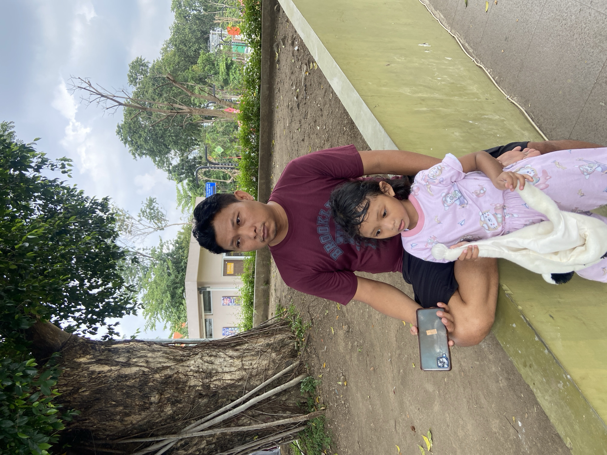 The scene depicts an adult male and a young female child situated on a low, light green concrete wall within a park environment in Sidoarjo, Indonesia. The man, of Southeast Asian ethnicity, wears a maroon short-sleeved t-shirt with "BROOKLYN" visible and black shorts. He sits cross-legged, holding a dark smartphone horizontally with a small light brown sticker on its back, and looks towards the right with a neutral expression. The child, also of Southeast Asian ethnicity, appears to be 3-6 years old, wearing light pink short-sleeved pajamas patterned with cartoon animals. She is positioned next to the man, holding a white plush toy, and looks downwards or towards the left. To the left of the subjects, a large tree with prominent aerial roots and a thick trunk dominates, topped with green foliage. The ground around this tree is dirt, interspersed with fallen leaves and sparse vegetation. Behind the man and child, beyond the low wall, is an expanse of disturbed dirt ground. In the background, a light-colored, single-story building with windows and posters on its facade is visible. Further back, an array of green trees, some with bare branches, and partially obscured blue and white signs are present under an overcast sky. A gray paved walkway runs parallel to the concrete wall on the right side of the frame.