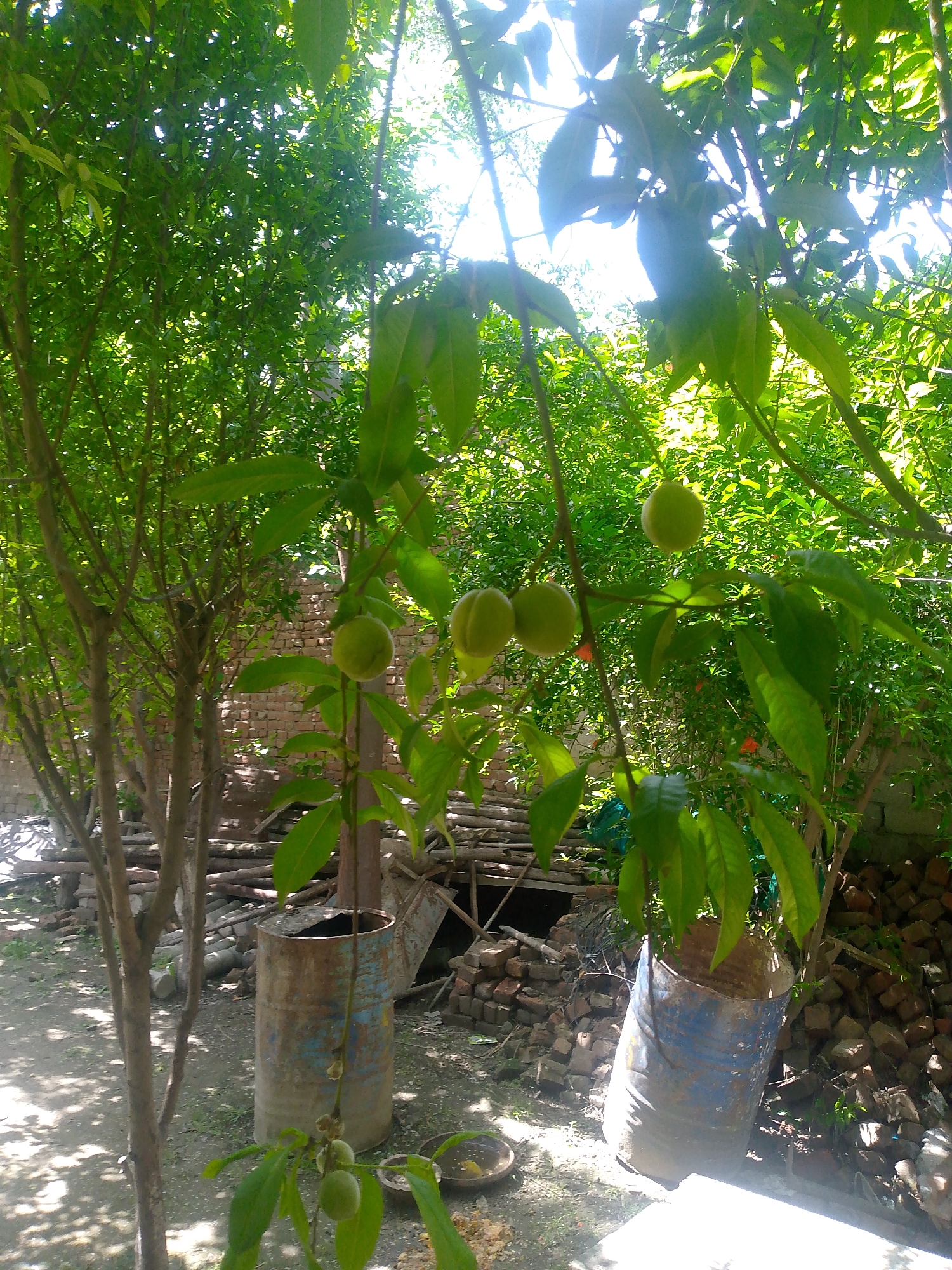 The image depicts an outdoor scene in a location identified as Unknown, Unknown, under bright sunlight. The focus is a tree with green leaves and unripe, green fruit hanging from its branches. Two rusted barrels are visible on the ground beneath the tree, with one appearing to be leaning slightly. A pile of bricks and wooden debris are scattered nearby, suggesting construction or demolition activity. The background is filled with dense green foliage, creating a sense of being in a garden or orchard. There are no people visible in the image.