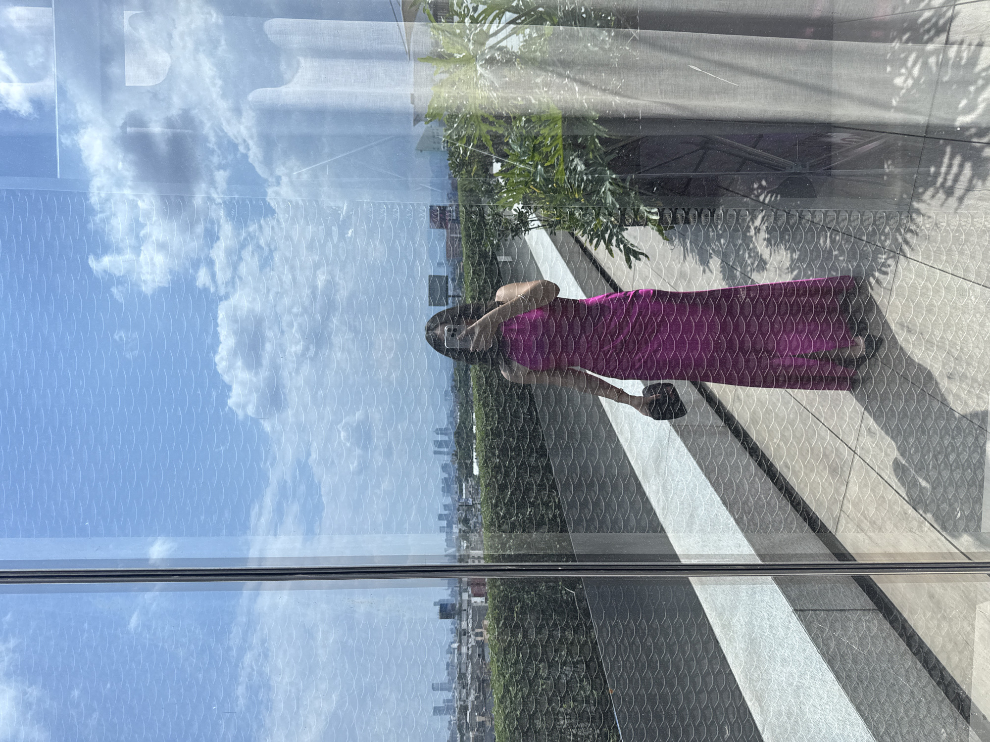 A reflection of a woman in a magenta dress, sunglasses, and a dark hat is seen in a window. She is taking a picture with her phone. The reflection also shows a building, sky, clouds, greenery, and a rooftop terrace. The location is likely Mexico City, Mexico.