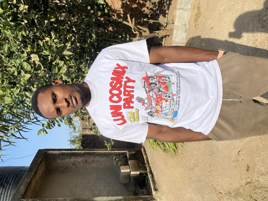 A young man stands outside on a sunny day, wearing a white T-shirt with "UNI COSMIX PARTY" in red lettering