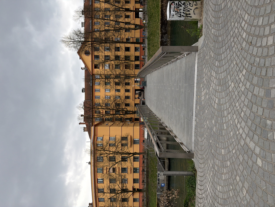 The image displays the Hladnik Bridge (Hladnikova brv) spanning the Ljubljanica River in the Špica area of Ljubljana, Slovenia, under an overcast sky. The foreground consists of a grey cobblestone path laid in a curved, fan-like pattern. The Hladnik Bridge, a pedestrian structure, features a light grey walkway and dark grey metal railings with wire mesh infill, extending towards the background. The Ljubljanica River, characterized by its dark green water, flows beneath the bridge. Its banks are covered in grass. On the left side of the river, a concrete structure with a small blue sign is visible near the water, with concrete steps leading up from the riverbank beside the bridge. In the background, a row of large, multi-story residential buildings with bright yellow facades and orange trim dominates the scene. These buildings, stylistically consistent with the architecture of Jože Plečnik, feature numerous dark-framed rectangular windows. The red-tiled roofs are visible, along with multiple chimneys. One central building section displays a prominent triangular pediment containing a circular decorative element. Bare deciduous trees are sparsely positioned along the riverbank and in front of the buildings. An arched passageway beneath one of the buildings reveals several parked vehicles, including cars and a white van. On the immediate right of the bridge entrance, a white utility box or electrical cabinet is covered with black graffiti. No individuals are present, and no actions or interactions are depicted within the frame.