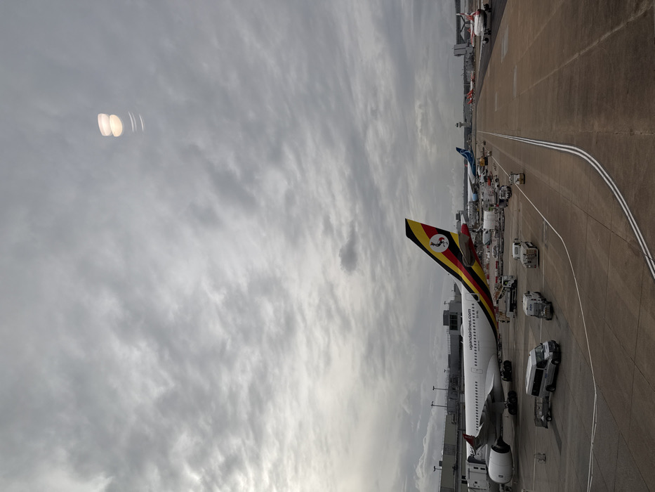 The image depicts an airport tarmac scene at London Gatwick Airport in Crawley, United Kingdom, under an overcast sky. A white Uganda Airlines Airbus A330 aircraft, registration 5X-NIL, is prominently positioned in the mid-ground, parked on a concrete apron. Its tail features a distinct livery of yellow, red, and black stripes with a grey crowned crane emblem. Text reading "ugandaairlines.com" is visible on the fuselage. The aircraft's left side is adjacent to a jet bridge. Surrounding the aircraft are various ground service equipment vehicles, including a grey passenger shuttle van, multiple baggage carts, ground power units, and a yellow tow tractor, indicating ongoing ground operations. In the background, further down the tarmac, other parked aircraft are visible, including a blue-and-white aircraft and a red-and-white aircraft. An air traffic control tower is discernible in the distant background. The sky is entirely covered by a dense layer of grey clouds. Two circular light reflections are present in the upper right quadrant of the image, consistent with a photograph taken through a window. No individuals are explicitly visible.