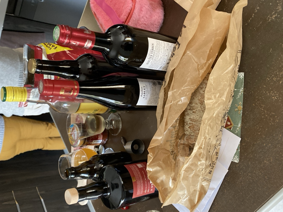 This image presents an indoor scene on a dark-colored countertop. The specific location within Pertuis, France, is not visually discernible from the image content. A baguette, partially wrapped in brown paper, is positioned horizontally in the foreground, resting on the countertop. A white piece of paper and a green greeting card with snowflake motifs are situated beneath the baguette's paper wrap. Arranged on the countertop are multiple bottles and glasses. Three dark glass bottles of red wine are prominent; one is labeled "HAUTES TERRES," and another is labeled "Aquilon SABLET" with "2023" visible, both featuring red foil capsules over their stoppers. A third dark glass bottle of wine is partially visible behind them. Also present are two dark glass beer bottles, one sealed with a gold cap and another empty. A clear glass bottle with a yellow screw cap, labeled "COLOGNE," stands upright. A distinct dark, squat bottle with a wooden stopper is visible on the left. Two glasses are on the countertop: a tall, clear glass containing an amber liquid, and a smaller stemmed wine glass holding a pale yellow liquid. A silver-colored corkscrew or bottle opener lies horizontally near the center of the arrangement. Additional items include a small jar with a red lid and a partially visible yellow-packaged bag of snacks or chips. On the far right, a bright pink, textured object, possibly a furry bag, is visible. In the blurred background, the lower torsos and legs of at least two individuals are partially visible. One individual wears mustard yellow pants and a light blue sweater, while another wears light blue pants and a light-colored top. Dark-colored kitchen cabinets or drawers are visible on the left side of the background.