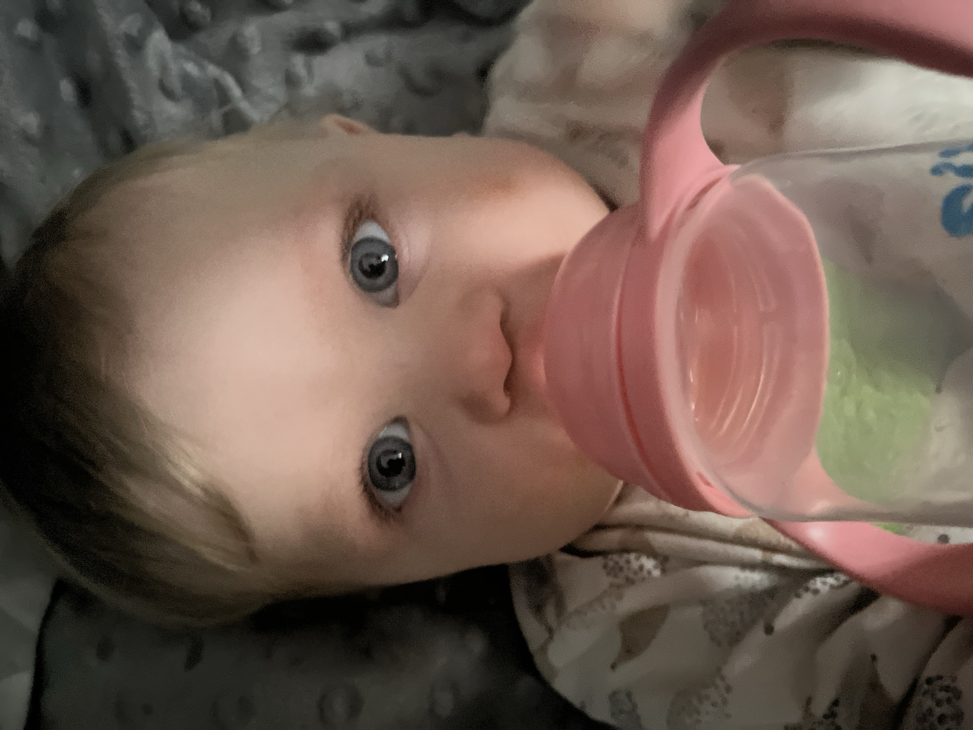 A young infant is depicted in a close-up, head-on shot, lying on or against a textured surface. The infant possesses fair skin, wide blue eyes, and light-colored hair. The mouth and lower nose are obscured by a transparent baby bottle with a pink lid and two pink handles. A light green substance is visible within the bottle. Partially visible blue lettering, including a stylized "S," is present on the bottle's lower right. The infant wears light-colored clothing with a subtle pattern. The background consists of a dark gray, textured fabric or blanket, with lighter gray areas suggesting varied texture or illumination. The overall lighting is dim. The image does not contain verifiable information regarding its location in Vesyoloye, Russia.