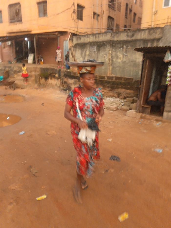 A woman in a red, patterned dress balances a tray on her head while walking on a dirt road. She carries a white bag in her hand. Buildings line the street with a few people visible in the background. The road is uneven with puddles and scattered litter. A small wooden structure is to the right with a person inside. The overall scene is of a street in a developing area.