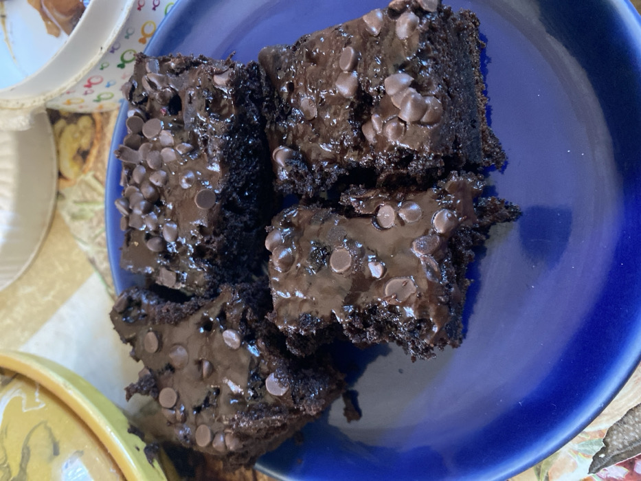 - "The image depicts five dark chocolate brownies arranged on a round, solid blue plate" by FM-MhJ4d2, licensed under CC BY 4.0