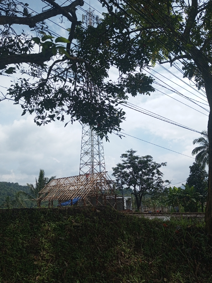 A tall metal transmission tower dominates the horizon amidst a cloudy sky. In the foreground, the skeleton of a building under construction is visible, draped with a blue tarp. The scene is framed by lush green trees and vegetation, creating a natural border. Power lines stretch across the sky near the top of the image. A hillside covered in foliage rises up to the building and tower.
