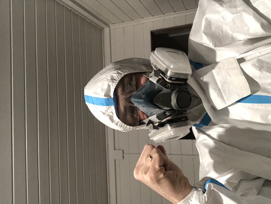 A person wearing a white hazmat suit and a respirator mask is looking at the camera