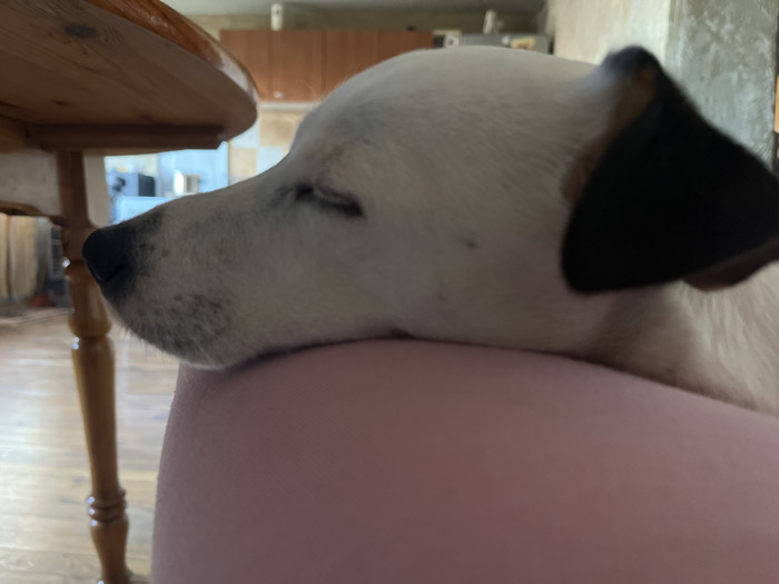 The image depicts an indoor scene in a residence located in the city of Lom, Bulgaria. A white dog with closed eyes and a visible dark ear rests its head on a pink surface, possibly a lap or cushion. The dog's muzzle features dark speckling. To the left, a light-brown wooden table leg with a polished finish is partially visible. The background is blurred, showing light wooden floorboards and indistinct light-colored furniture, consistent with a domestic environment.