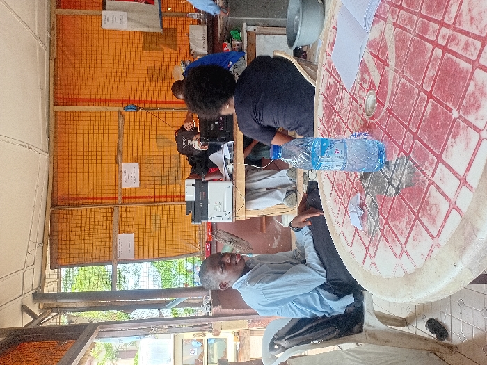 The image displays an indoor commercial space, likely a printing or internet café, within the city of Unknown, Unknown. In the foreground, a male with short dark hair, wearing a light blue long-sleeved shirt and dark trousers, sits on a white plastic chair, looking towards the camera. A black backpack rests on the chair behind him. Directly in front is a round, white plastic table featuring a faded red and grey geometric pattern. On the table, a clear plastic water bottle with a blue cap stands next to a small white paper origami object and an open notebook. In the mid-ground, a person with dark, curly hair, wearing a dark t-shirt, sits facing away from the camera at a desk. The desk holds a light-colored laser printer/copier, a black computer monitor, and multiple stacks of paper. The lower legs of another individual, wearing light-colored pants and sandals, are visible beneath this desk. Farther back, a fourth individual is partially obscured. The background walls consist of orange grid-patterned panels, possibly woven mats, to which white papers are affixed. Exposed wooden beams and metal supports comprise the ceiling structure. An opening or window on the left reveals green foliage outside. A brown ceiling fan is partially visible in the upper left, and a grey plastic basin is positioned on a table to the far right.