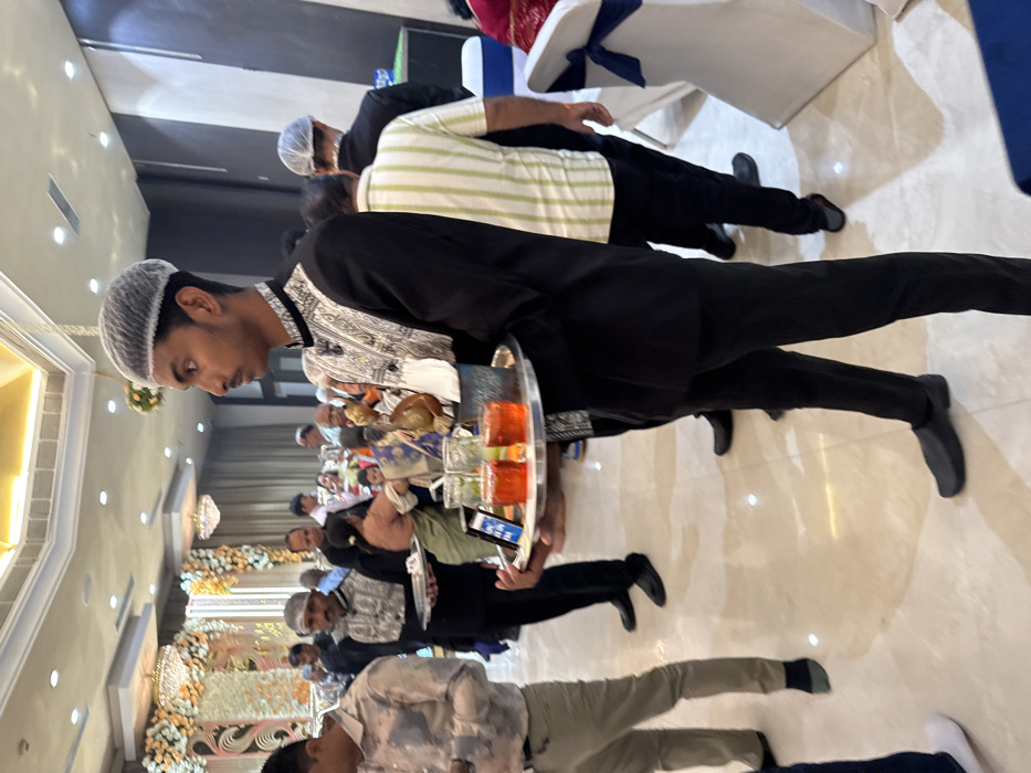 A banquet hall setting shows individuals serving refreshments. A waiter in a black coat and white patterned shirt, wearing a white cap, carries a silver tray with orange drinks and glasses. Diners are seated at tables. A floral arch is visible in the background. Others wearing white caps also serve food.